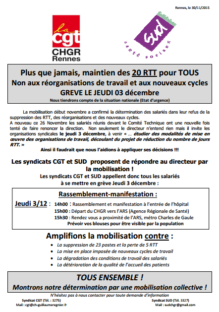 Accueil > Fonction Publique Hospitalière > Sud CHGR Rennes > Grève et manifestation au CHGR le 3 décembre à 14h