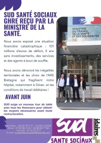 Mesdames, Messieurs, le 4 Mars 2026, notre organisation syndicale SUD Santé Sociaux GHRE a été reçue pendant 1 heure 15 par la Ministre de la Santé. Une rencontre que nous pouvons qualifier de constructive. Nous tenons tout d’abord à remercier Hervé Berville et Jean-Luc Bourgeaux, les deux députés de nos circonscriptions, qui ont introduit (...)