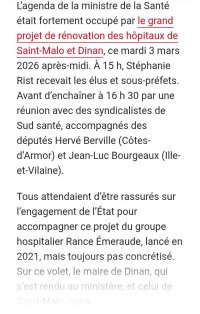 « L’agenda de la ministre de la Santé était fortement occupé par le grand projet de rénovation des hôpitaux de Saint-Malo et Dinan, ce mardi 3 mars 2026 après-midi. À 15 h, Stéphanie Rist recevait les élus et sous-préfets. Avant d’enchaîner à 16 h 30 par une réunion avec des syndicalistes de SUD santé Sociaux, accompagnés des députés Hervé Berville (Côtes-d’Armor) et Jean-Luc Bourgeaux (Ille-et-Vilaine). »✊🟣