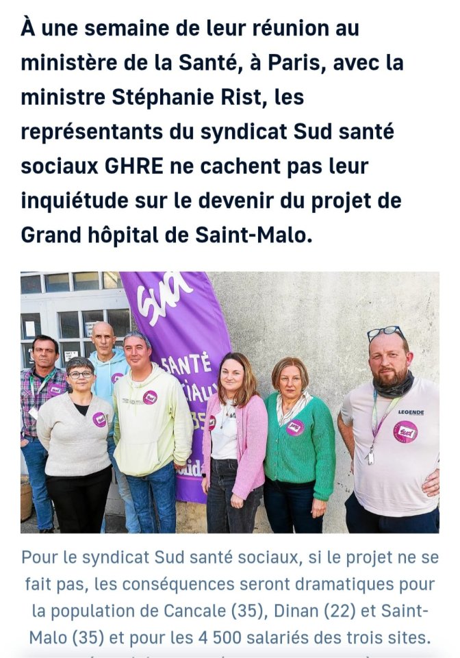 « À une semaine de leur réunion au ministère de la Santé, à Paris, avec la ministre Stéphanie Rist, les représentants du syndicat Sud santé sociaux GHRE ne cachent pas leur inquiétude sur le devenir du projet de Grand hôpital de Saint-Malo. »✊🟣