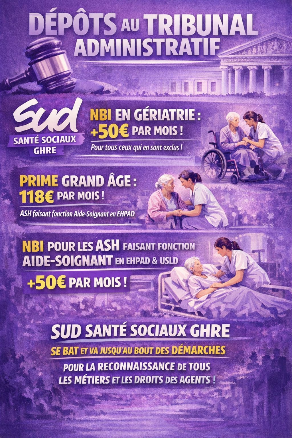 Nous avons déposé 3 requêtes introductives d’action en reconnaissance de droit au Tribunal Administratif qui concernent certains services de gériatrie - MAG et EHPAD, afin de rétablir le droit des agents.