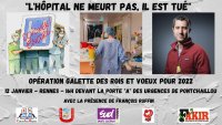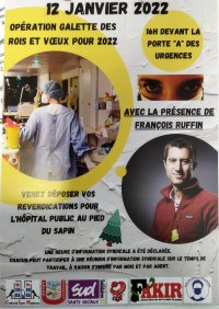 7 janvier 2022, par Sud Santé Sociaux 35Opération galette des rois et vœux pour 2022. Venez déposer vos revendications pour l’hôpital public au pieds du sapin. Avec la participation de François RUFFIN député LFI. Rendez vous devant la PORTE A des urgences du CHU Pontchaillou le mercredi 12 janvier à 16h00. Une heure d’information syndicale à été déclarée : Chacun peut participer à une réunion d’information syndicale SUR LE TEMPS DE TRAVAIL à raison d’une heure par mois et par agent. -